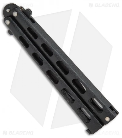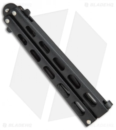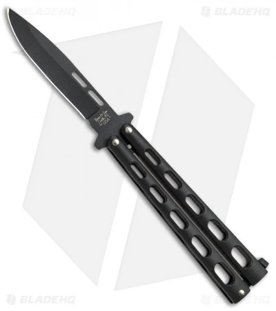The Bear & Son 115B butterfly knife is built with durable black epoxy coated zinc handles with a skeletonized design for reduced weight. It features a stainless steel drop point blade with a black coating that matches the handles for a unified aesthetic. This is a solid mid-range butterfly knife, made right here in the USA.
