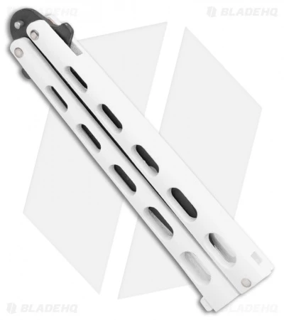 The Bear & Son 115BTR butterfly knife trainer is built with durable white epoxy coated zinc handles with a skeletonized design for reduced weight. It features a stainless steel drop point blade with a black coating.