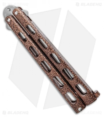 The Bear & Son 115 butterfly knife is built with durable Copper Vein epoxy coated zinc handles with a skeletonized design for reduced weight. It features a 440 stainless steel blade with a satin coating. This is a solid mid-range butterfly knife, made right here in the USA.
