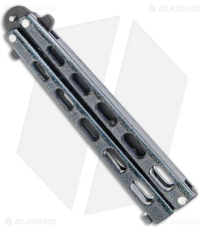 Bear & Son butterfly knife features a stainless steel trainer blade with a tough epoxy coating over its durable steel handles. The handles feature a skeletonized design to reduce weight.