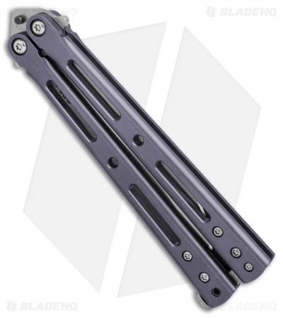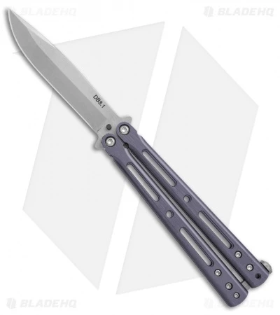 This Blade HQ exclusive DB3.1 Balisong has a stonewashed 440C stainless steel blade and purple anodized titanium handles.