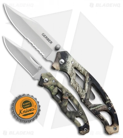 This Gerber Paraframe Combo Pack offers 2 Gerber folding knives for a great bargain price. It includes a Paraframe 1 with a partially serrated 3″ blade, and a Paraframe Mini with a 2.5″ plain edge blade. Both knives are outfitted with skeletonized aluminum handles in a Mossy Oak Camo finish. These Paraframe models include stainless steel pocket clips for tip-down carry. Pick up an awesome deal on two Gerber knives with the Paraframe Combo Pack.