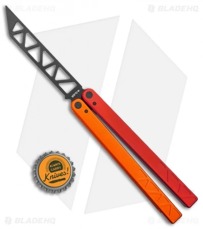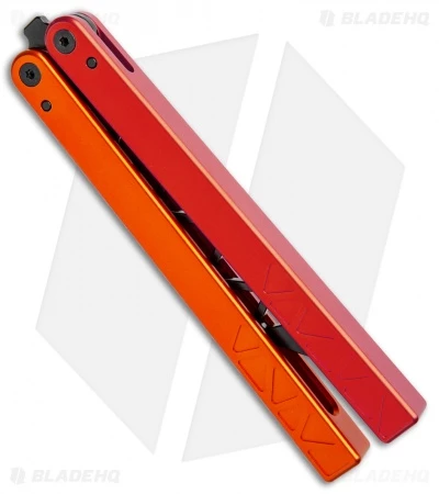 This Mars balisong trainer features a black blade and a red handle and an orange handle.
