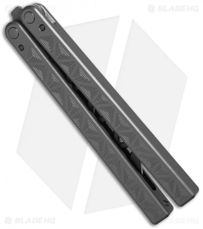 This Rhino Gray balisong trainer features a black blade and dark gray handles.