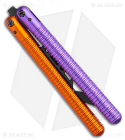 This SAHARA Jupiter balisong trainer features a black blade and blue and orange handles.