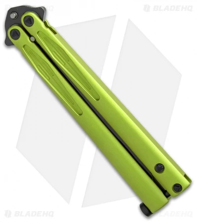 The latest generation of the Tachyon butterfly knife, the production Microtech Tachyon III, distinguishes itself from previous models with milled, single-piece channel construction handles, a spring latch, and a standard pocket clip. The blade showcases a non-sharpened swedge-ground tip and milled grooves with the Microtech logo, production date, and blade steel markings up front.