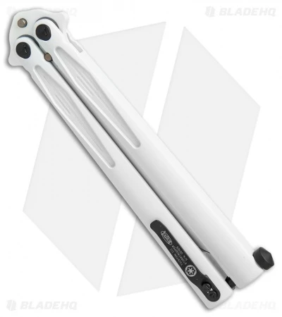 The latest generation of the Tachyon butterfly knife, the production Microtech Tachyon III, distinguishes itself from previous models with milled, single-piece channel construction handles, a spring latch, and a standard pocket clip. The blade showcases a non-sharpened swedge-ground tip and milled grooves with the Microtech logo, production date, and blade steel markings up front.