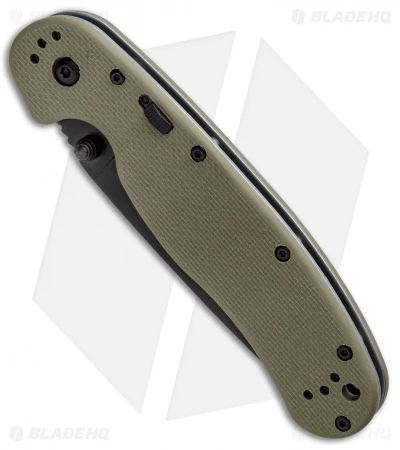 This Assisted RAT Model 1 features textured OD green G-10 scales and a black coated AUS-8 stainless steel blade with a plain cutting edge.
