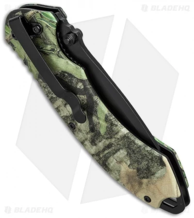 The spring assisted opening of this Remington Sportsman Series FAST 2.0 knife makes releasing the blade simple and smooth using the ambidextrous thumb studs. The drop point blade is made of 440 stainless steel with a black finish. The handle is camouflage finished aluminum with finger grooves and a slight curve for a secure, comfortable grip, and jimping on the index groove and spine for added safety. The pommel features two lanyard holes, and there is a tip-down carry pocket clip for convenient carry.