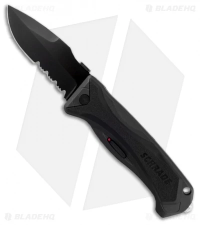 The SCHA6LBS knife has a black aluminum handle and black finished stainless steel blade with a partially serrated edge.