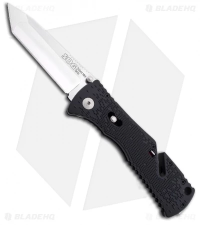 SOG Trident mini assisted opening knife. AUS 8 tanto stainless steel blade with a Zytel handle and a seatbelt cutter. Uses the SOG assisted technology which gives it fast opening action. Reversible pocket clip. The knife also includes a safety ensures the knife remains locked unless you choose otherwise.