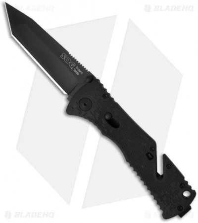 The SOG Trident (TF-7) has a black TiNi finished Tanto blade with a plain cutting edge. The handle is black glass reinforced nylon (GRN).