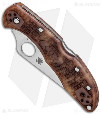 This Spyderco Delica 4 knife has a limited edition Zome desert camo FRN handle and a full-flat ground VG-10 stainless steel blade that is satin finished with a plain cutting edge.