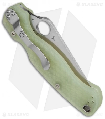 - Exclusive G-10 handle scales in natural jade over stainless steel liners.