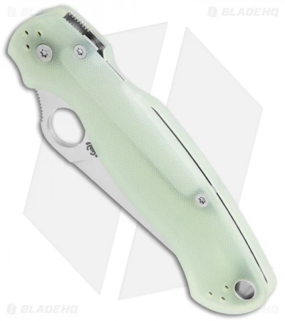 - Fine-textured G-10 handle scales in natural jade over stainless steel liners.