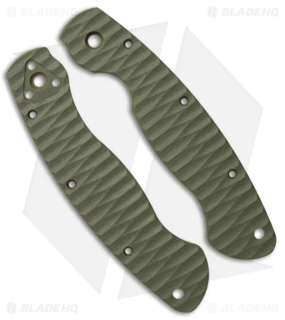 This listing is for two OD Green G-10 replacement scales for the Spyderco Military folding knife. Features deep relief sculpted surface. Designed by Allen Putman.