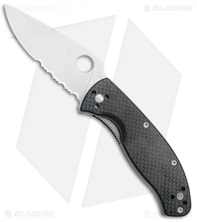 - Textured black G-10 handle with a carbon fiber inlay.