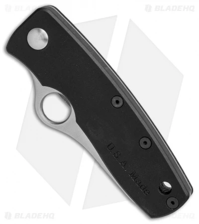 The Spyderco Terzuola Jr. features a partially serrated ATS-34 steel sheepsfoot blade with a satin finish and signature Spyderco Thumb Hole for easy opening. This model has aluminum handle scales with a black finish. Includes a stainless steel pocket clip for right-handed tip-up or tip-down carry.